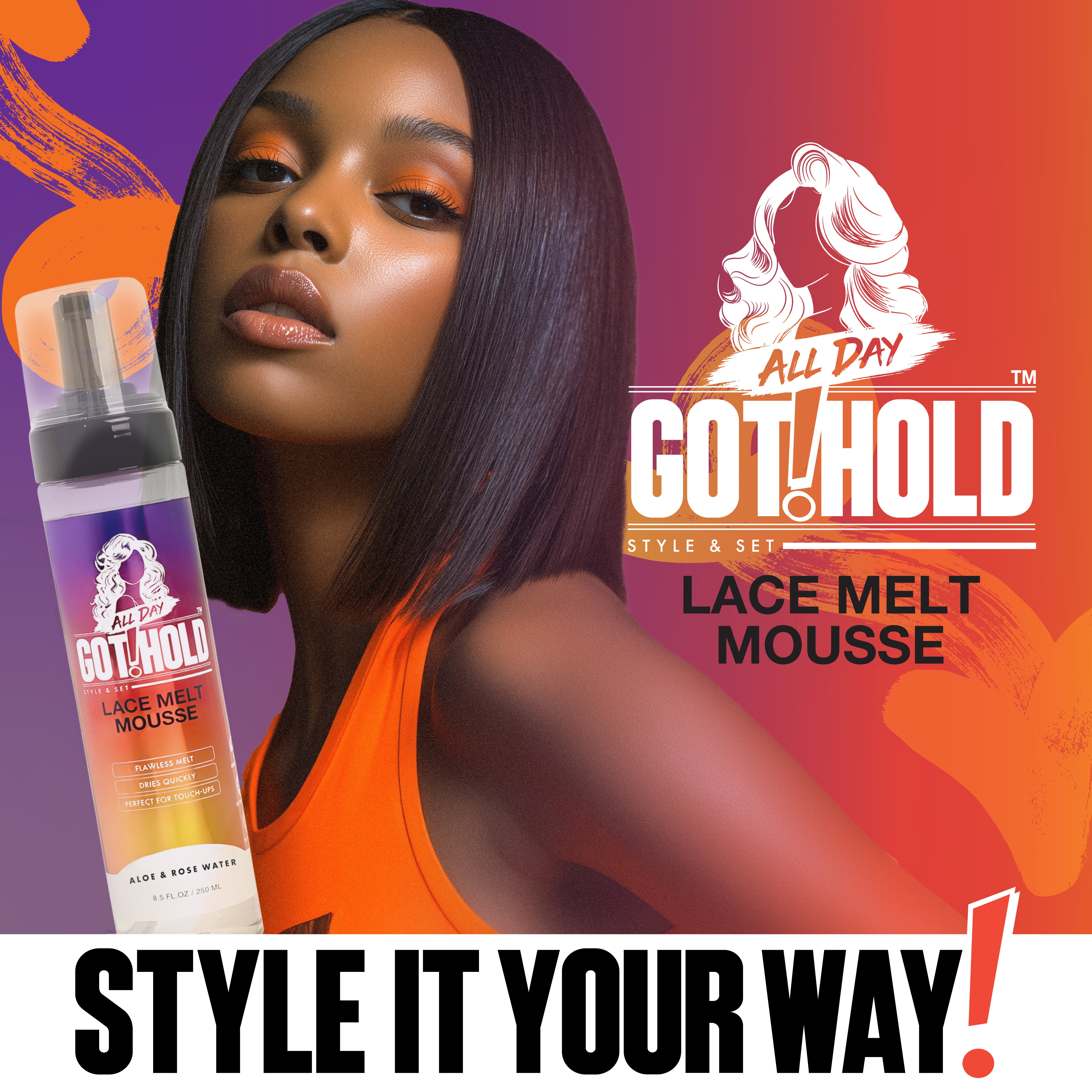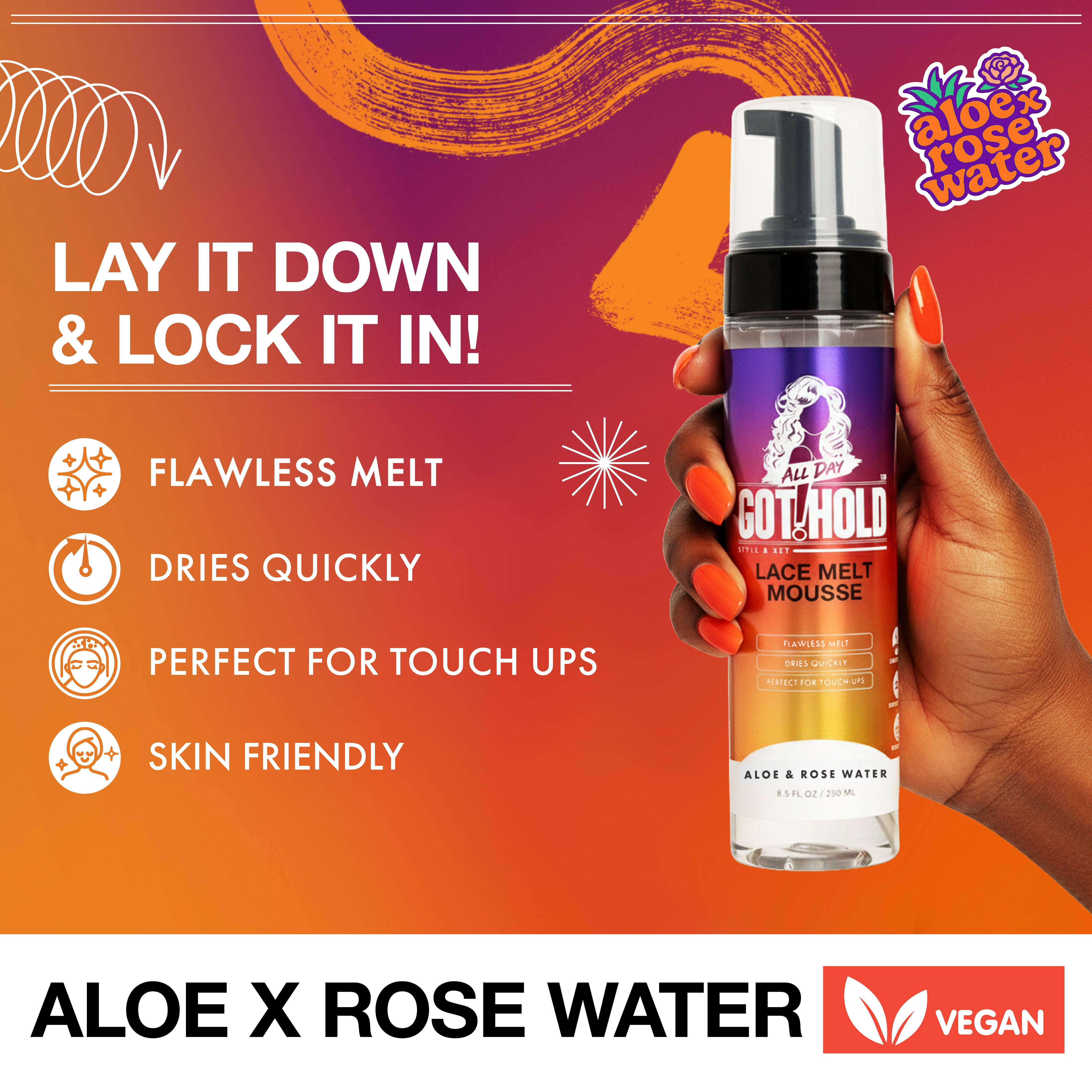 Style smarter with ALL DAY GOT HOLD Lace Melt Mousse, crafted for natural blends and sleek edge definition. This soft-hold mousse smooths flyaways and melts lace effortlessly while adding shine and control. Infused with Aloe & Rose Water, it hydrates, soothes, and protects your hairline for irritation-free wear. The non-sticky texture dries quickly and resists buildup, keeping your style flexible yet polished. Designed for everyday use or finishing touches, it offers the perfect balance of moisture, hold, and clean performance.