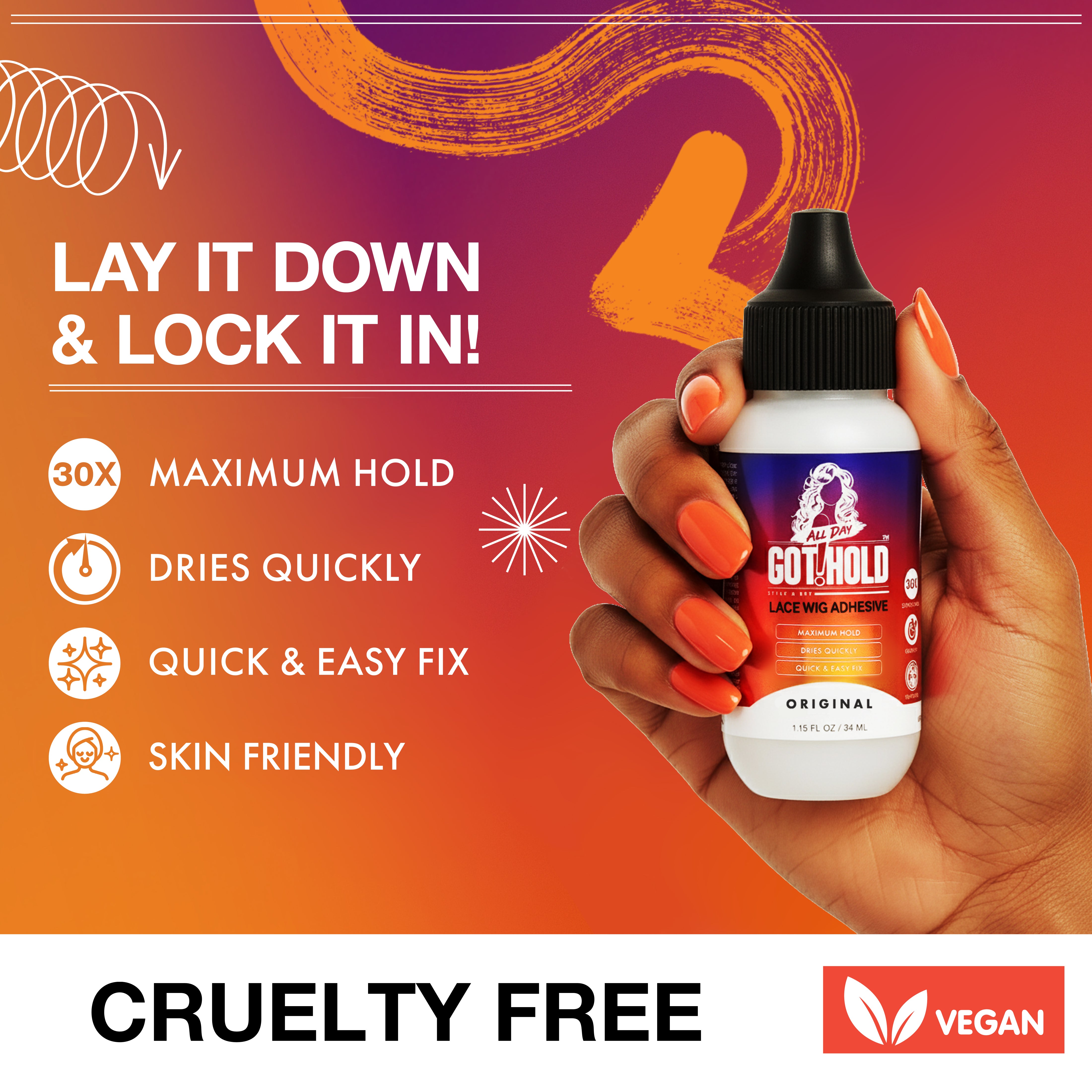 Lock in flawless lace installs with ALL DAY GOT HOLD Lace Wig Adhesive. This professional-grade formula delivers unbeatable strength and flexibility while remaining gentle on your skin. Enriched with Aloe & Rose Water, it calms and hydrates the scalp, preventing irritation during long wear. The lightweight, fast-drying texture blends invisibly into the skin, providing natural-looking results that withstand heat, humidity, and daily activity. Ideal for both beginners and stylists, this vegan adhesive keeps your lace secure, smooth, and picture-perfect all day.